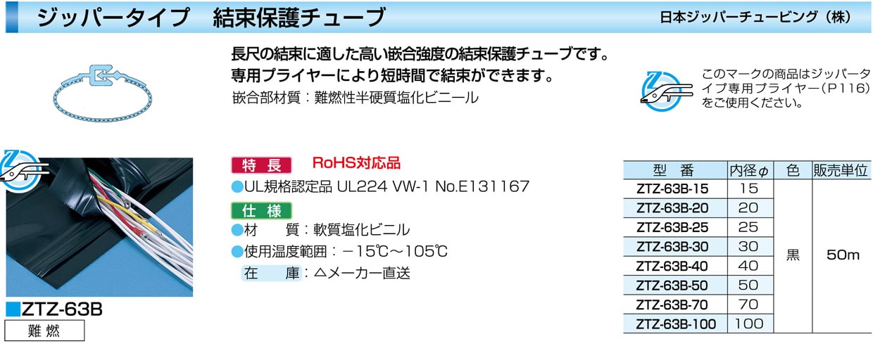 ジッパーチューブ ZTZ63B-15 【商品コード】50192 【JAN】4548291501920 ジッパーチューブ ZTZ63B-15 属性 材質:軟質塩化ビニル、使用温度範囲:-15℃~105℃、内径Φ:15、色:黒 配線資材 ジッパー・ホック P118 Z ジ 日本ジッパーチュービング 参考単価: オープン 仕切単価: 注文ロット数: 50m 数量 (m): 1 50 カタログ表示 カタログ118ページ 図面PDF おすすめ商品一覧 ジッパーチューブ プライヤー ZTプライヤー 数量 (丁): 1